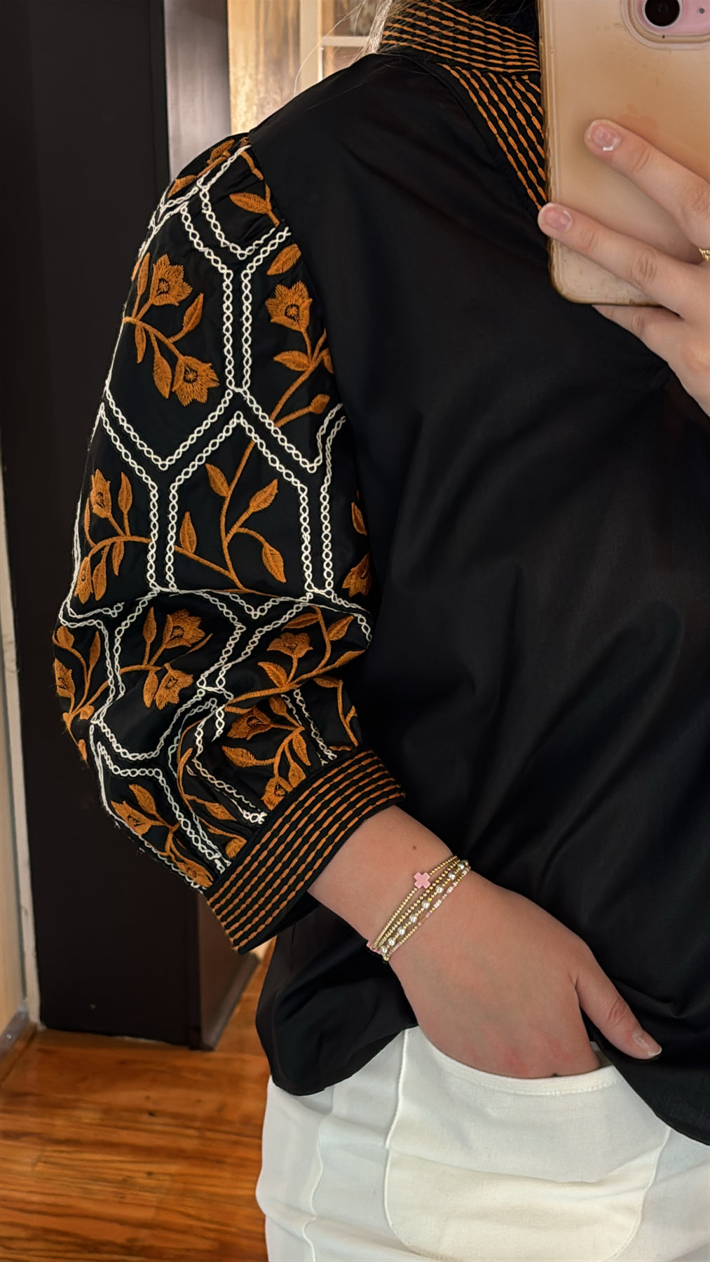 Effortlessly feminine, this Three-Quarter Floral Sleeve Top is perfect for transitioning into fall. With its flattering fit and soft floral accents, it pairs beautifully with denim, trousers, or skirts for a polished look that works from day to night.