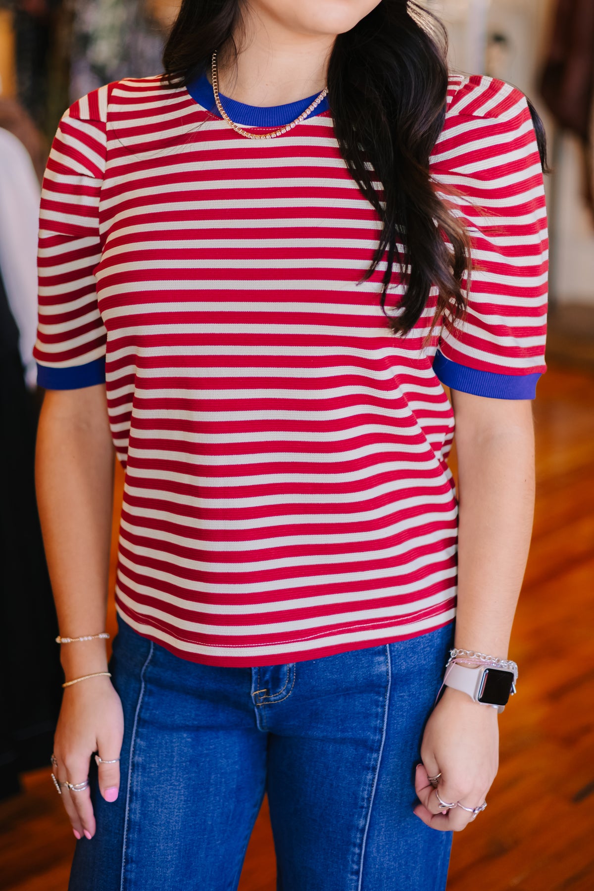 Stripe pattern short sleeve pullover top featuring contrast accent band detail. Unlined. Knit. Non-sheer. Lightweight.
