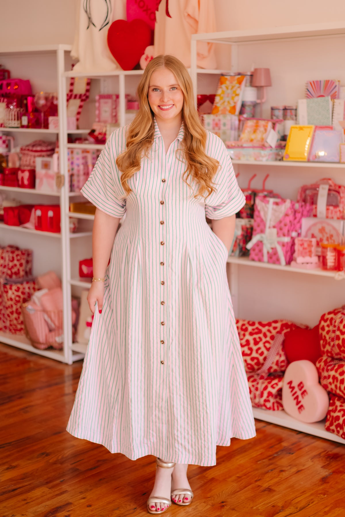 This charming short sleeve button-down dress features playful pink and green stripes paired with a statement maxi collar for a fresh, feminine look. Designed with a flattering, easy silhouette, it blends classic tailoring with a fun pop of color. The lightweight fabric keeps it comfortable for all-day wear, while the bold collar adds just the right touch of personality.