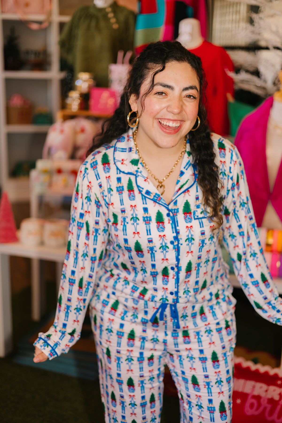 Bring the magic of the holidays to bedtime with our Merry Marchers Pajama Set. Featuring a playful print of festive characters and crafted from soft, lightweight fabric, this set combines comfort and cheer in the best way. The classic button-front top and relaxed fit make it perfect for cozy nights, movie marathons, or Christmas morning fun.