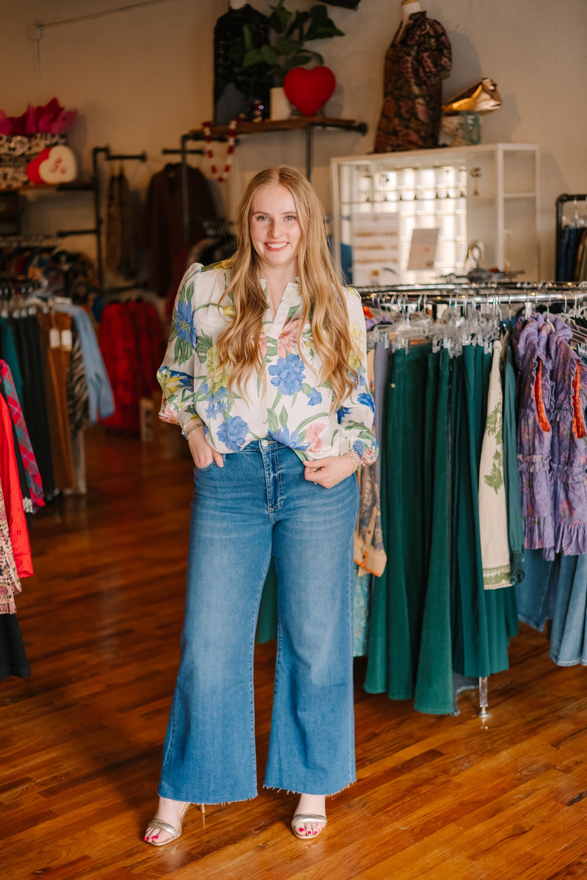 The Long Sleeve Smocked Blouse is the perfect blend of romantic and refined. Featuring a colorful floral print, lightweight feel, and delicate smocked detailing, this top offers a flattering fit with beautiful texture. The ruffle collar adds a soft feminine touch, making it easy to dress up with tailored pieces or keep effortless with your favorite denim. Light, airy, and full of charm — it’s a standout you’ll love wearing all season.