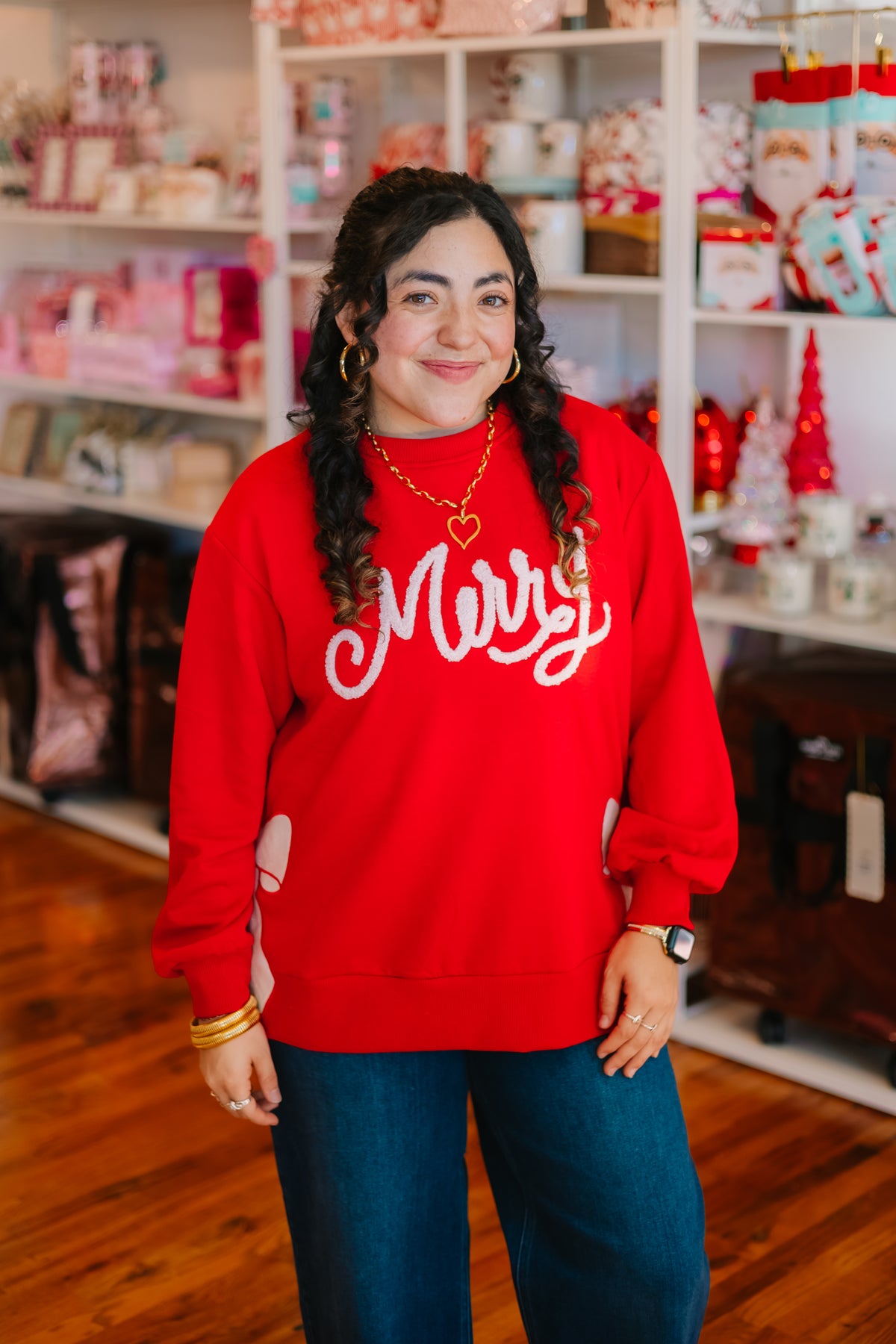 Celebrate the season in style with our Lakelyn Merry Bow Sweatshirt! This adorable piece features a festive “Merry” graphic accented with a charming bow detail for the perfect feminine touch. Crafted from soft, cozy fabric with a relaxed fit, it’s the ideal blend of comfort and holiday cheer — perfect for pairing with leggings or denim all season long.